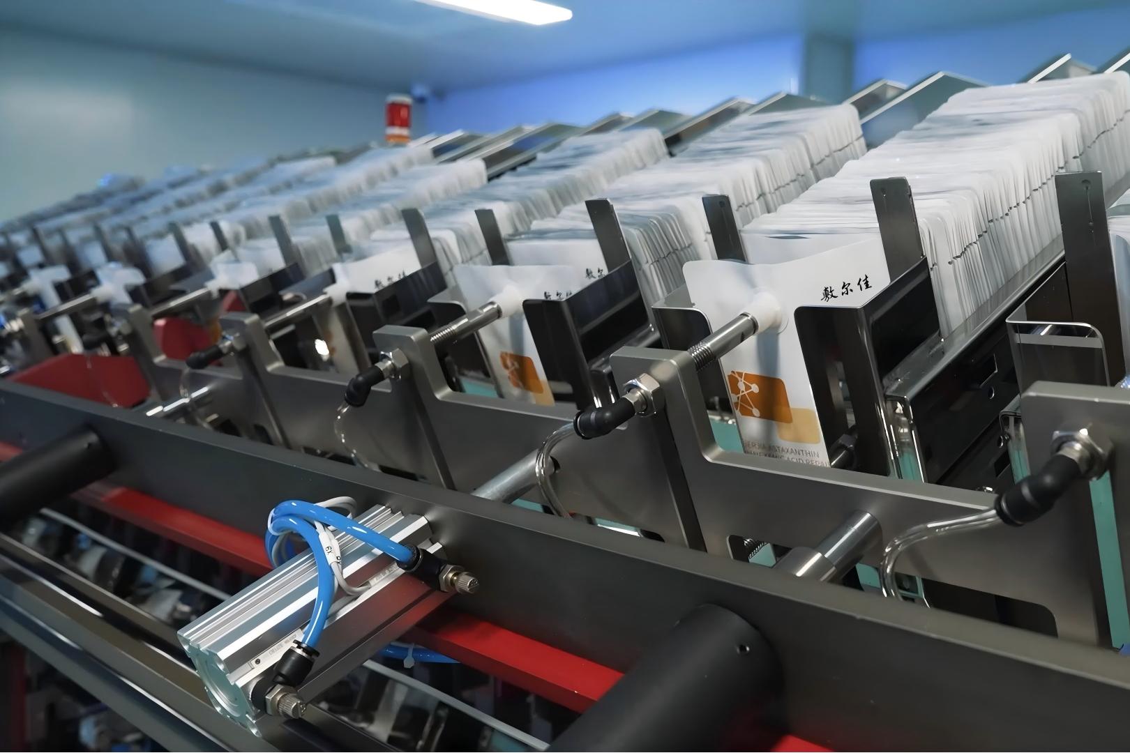 - 产品灌装环节配有全自动面膜灌装机、激光打码、在线装量检测、视觉检测,均可实现灌装自动化系统,全自动面膜灌装机选用行业一流品牌设备,人机交互程度高,操作简便。配有在线检测技术,及时将不良品发现与剔除,对产品质量进行有效把关;配有机械人手臂代替人工操作,降低工作强度与人工成本