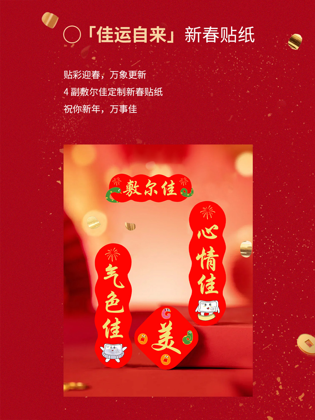 以好运红为主色,将敷尔佳元素与春节元素结合,推出对联贴纸与趣味红包,寄予诠释乙巳年的美好祝愿。
